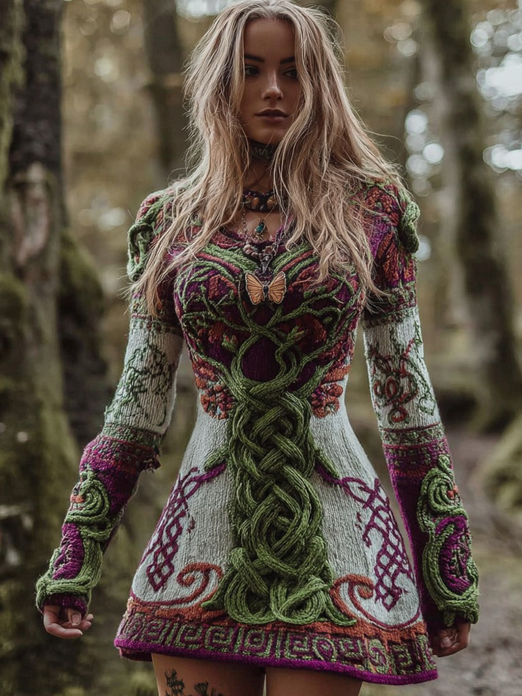 Women's Vintage Viking Celtic Knot Tree Of Life Knitted Sweater Flared Skirt
