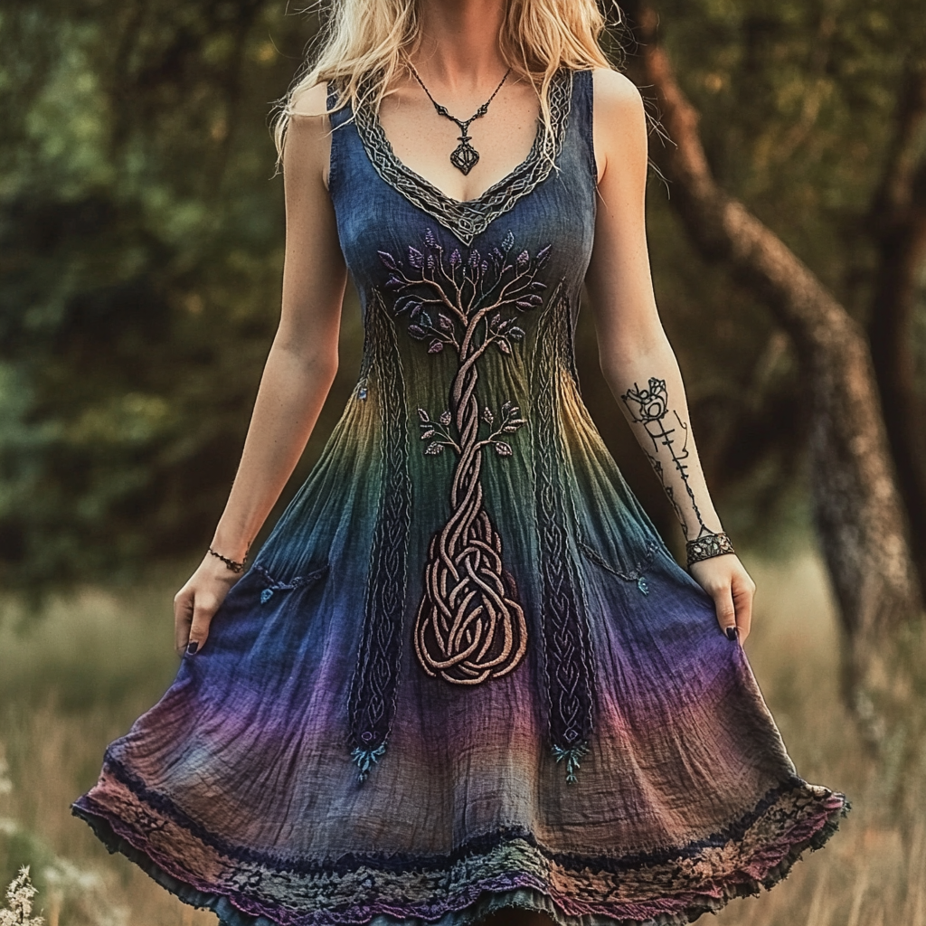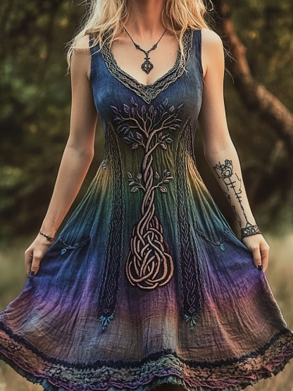 Women's Vintage Viking Tree Of Life Gradient Art Linen Waist Short Midi Dress