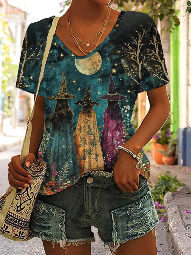 Womens Witch And Flowers Under The Full Moon Art Print T-Shirt