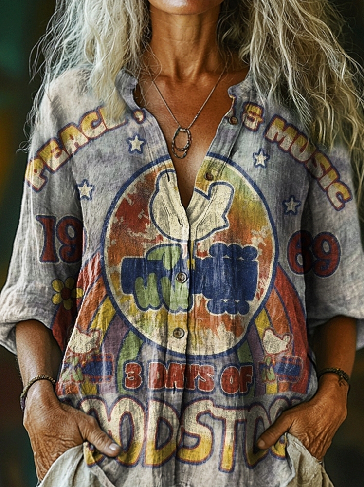 Women's Woodstock 1969 Pattern Print Casual Cotton Linen Shirt