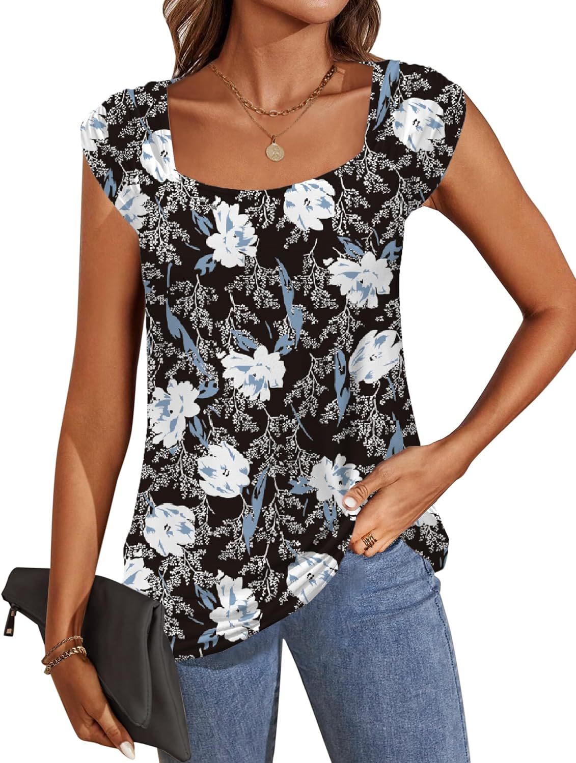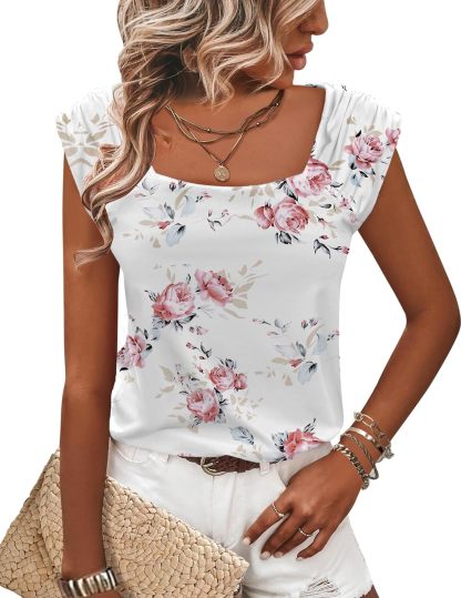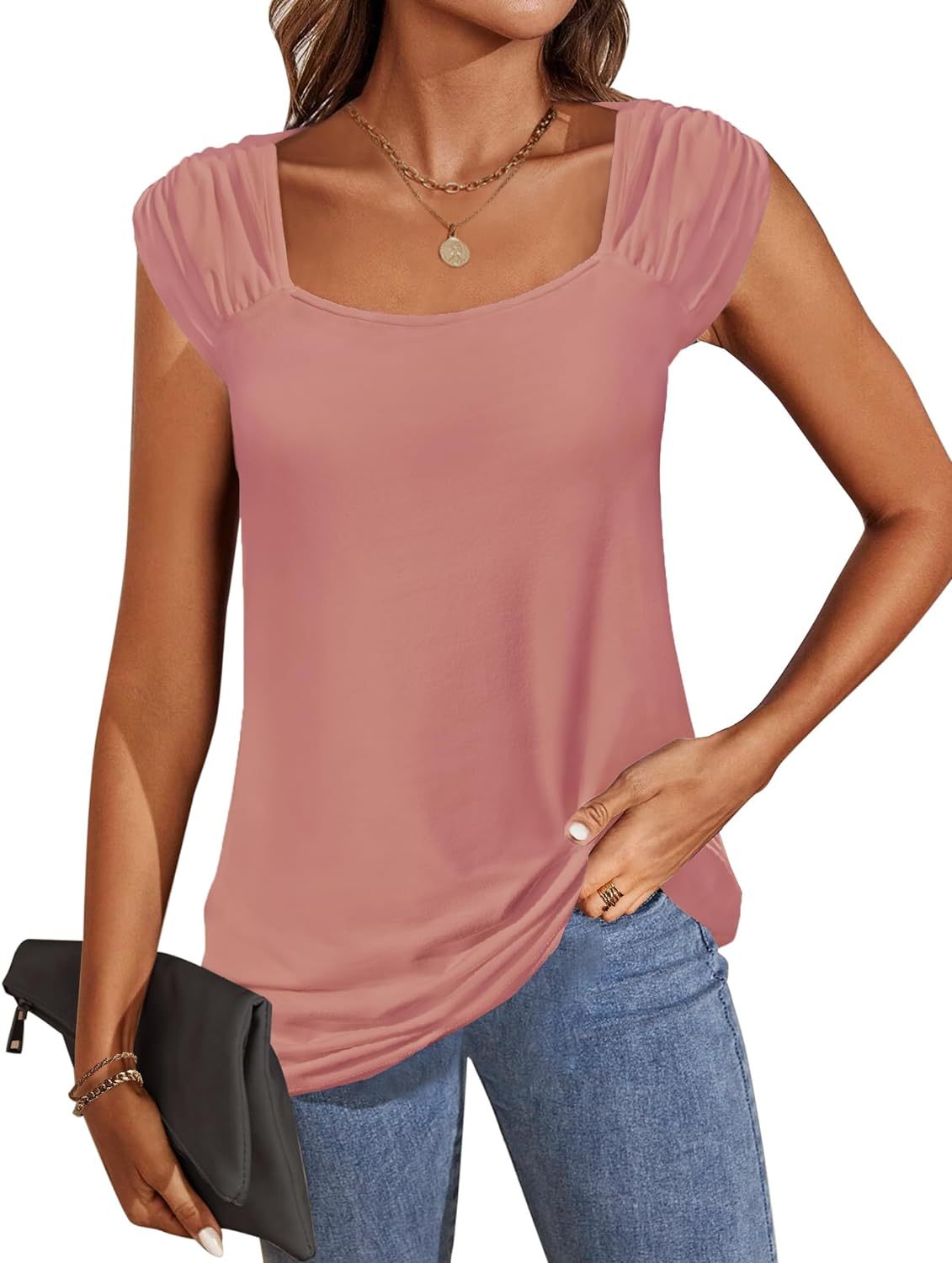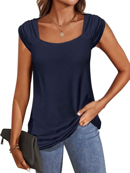 Unique Design: square neck tank top for women, suitable for any neck shape, solid flowy loose fit basic shirts for women, cap sleeve give your confidence to show your charming arm line, you will flattering with the fashion pleated shoulder design.