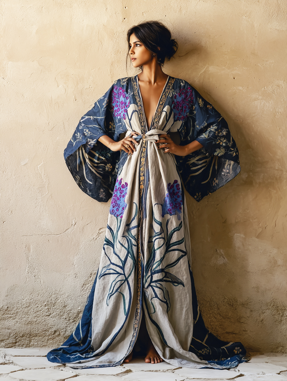 Moonlit Wisteria Kimono Linen Long Gown Robe With Belt
