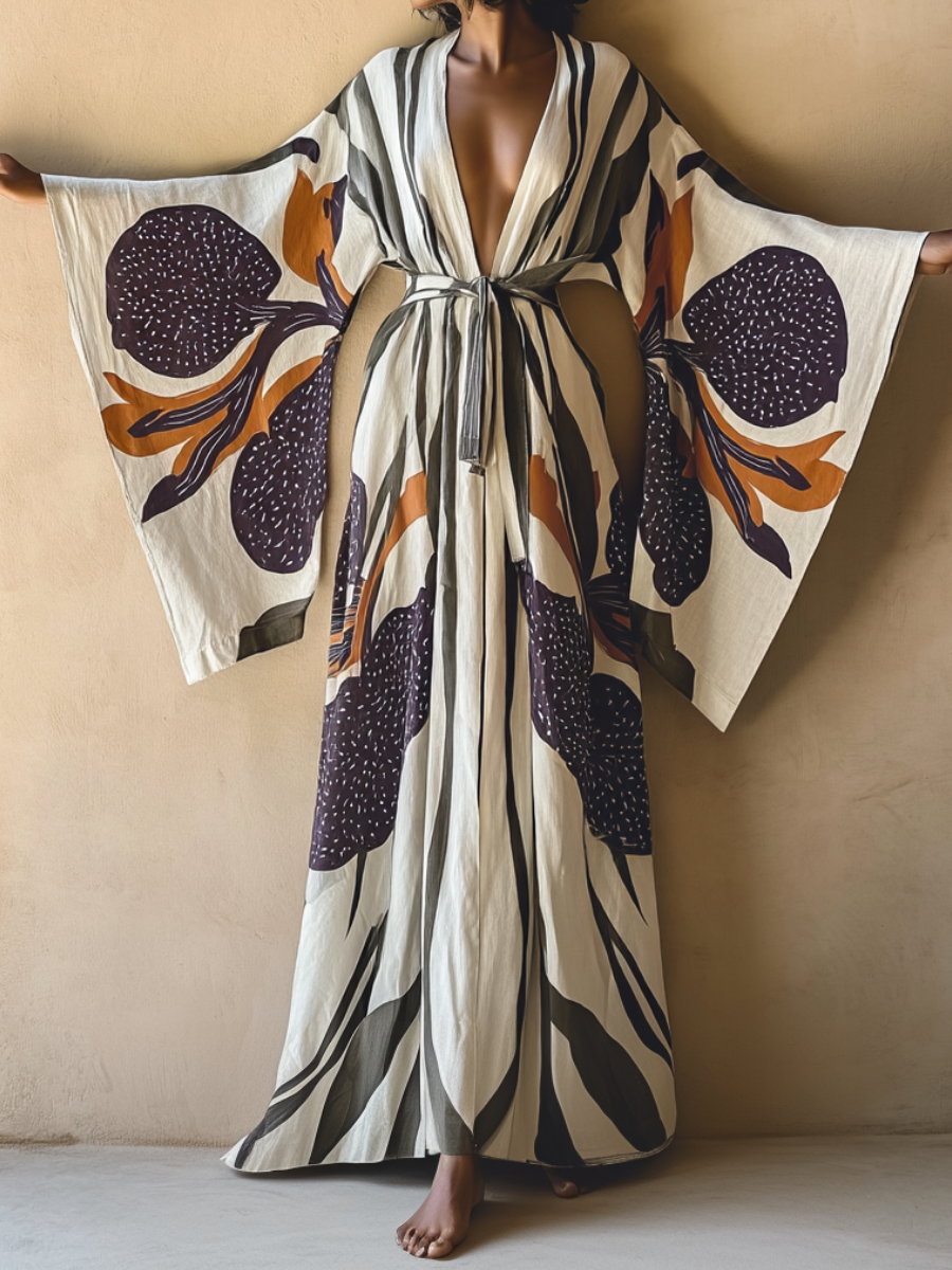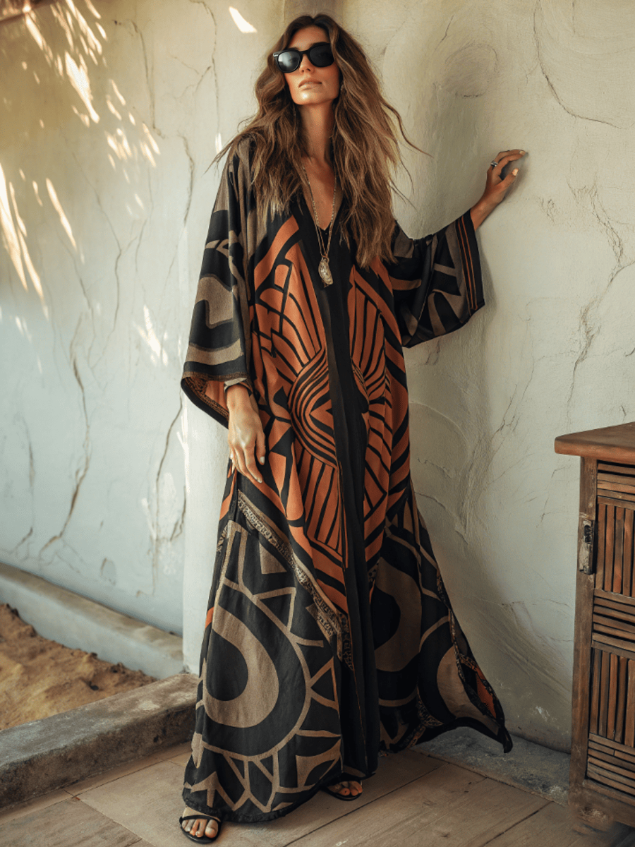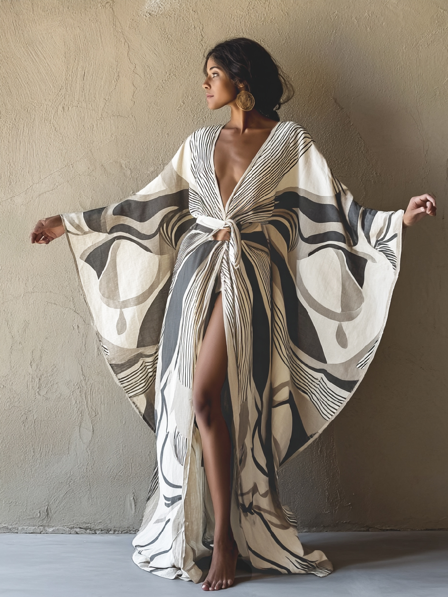 Linen Abstract Vintage Print Kaftan Maxi Dress
