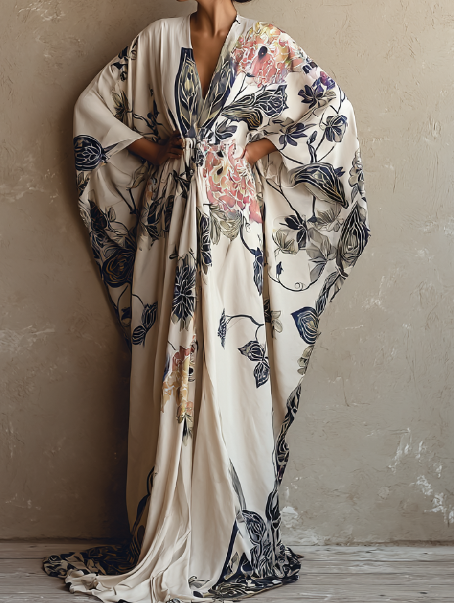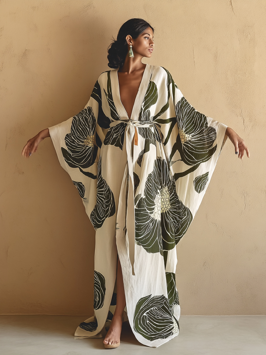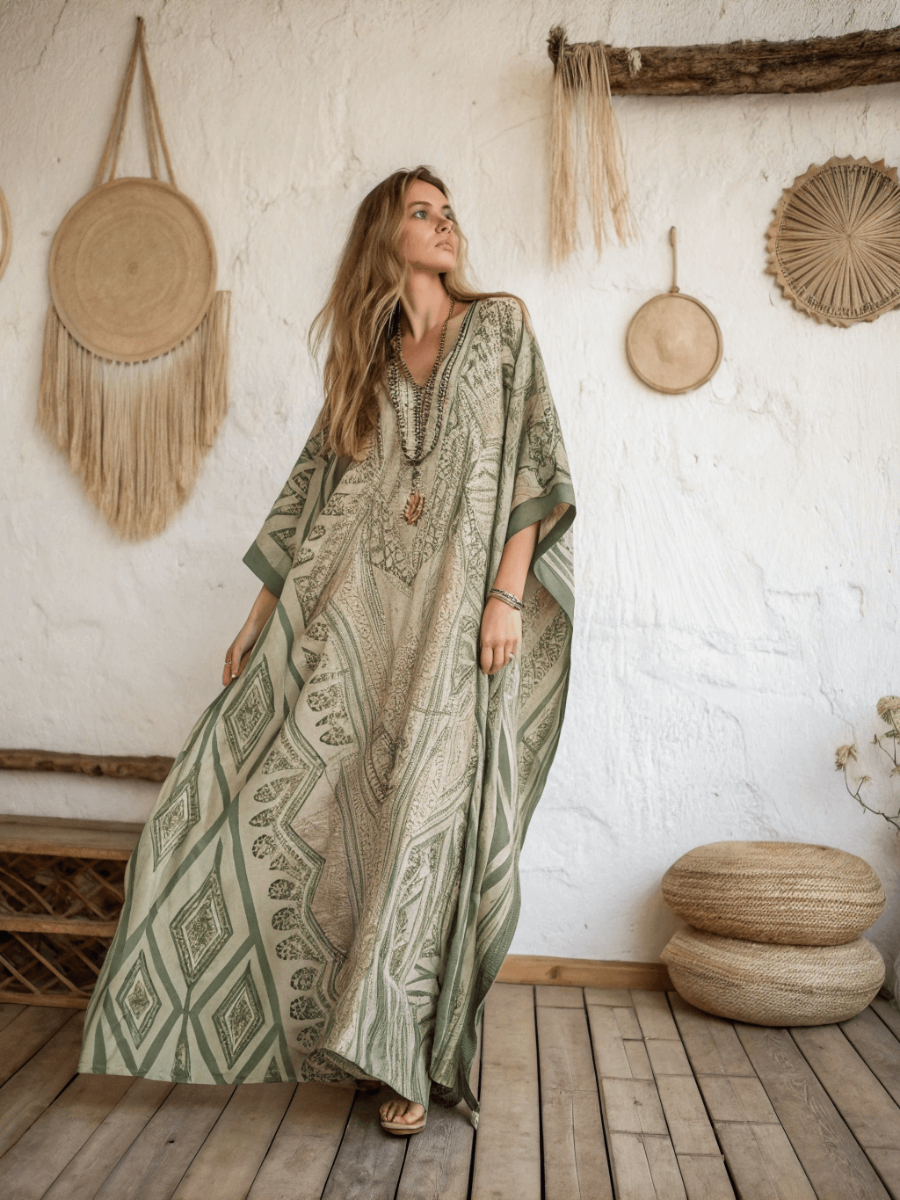 Linen Abstract Vintage Print Kaftan Maxi Dress