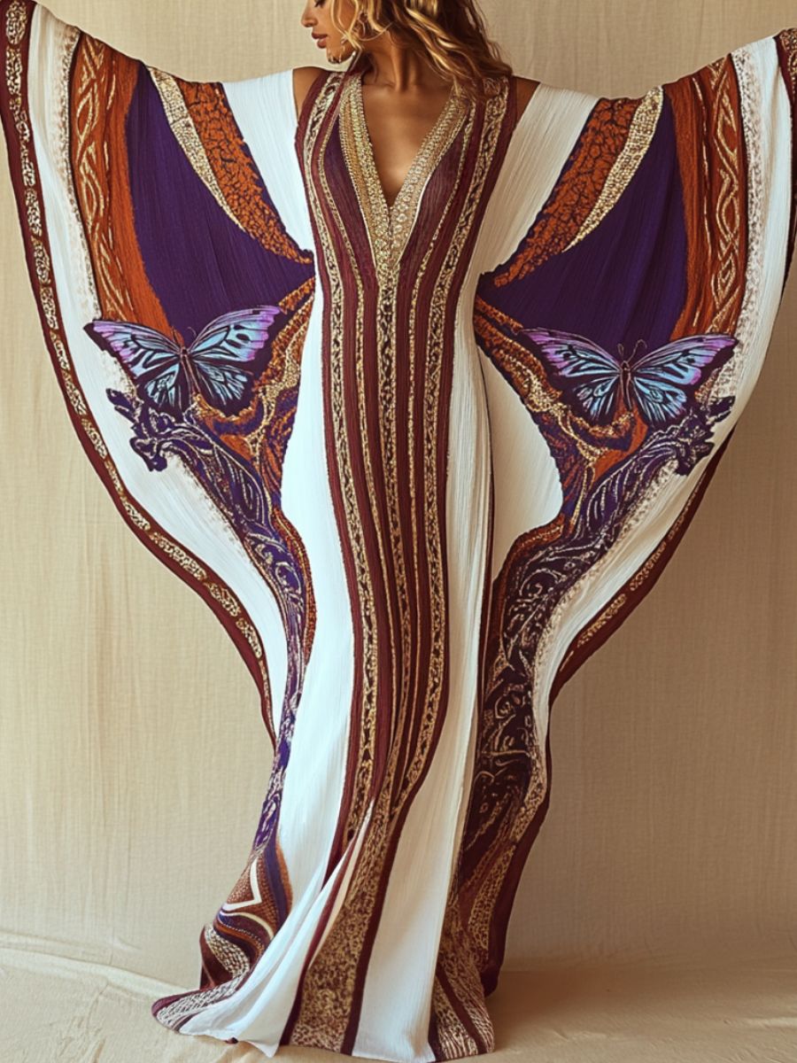 Women's Purple Butterfly Striped Linen V-Neck Kaftan