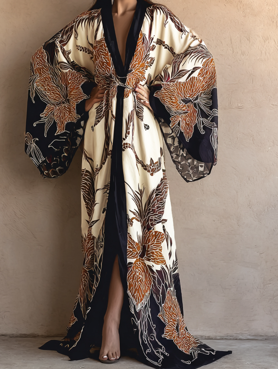 Women's Summer Leaves Kimono Linen Robe (Including Belt)