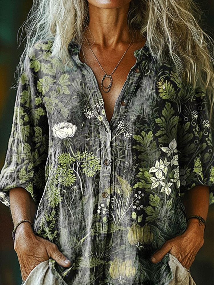 Floral Pattern Art Print Cotton Linen Casual Women's Shirt