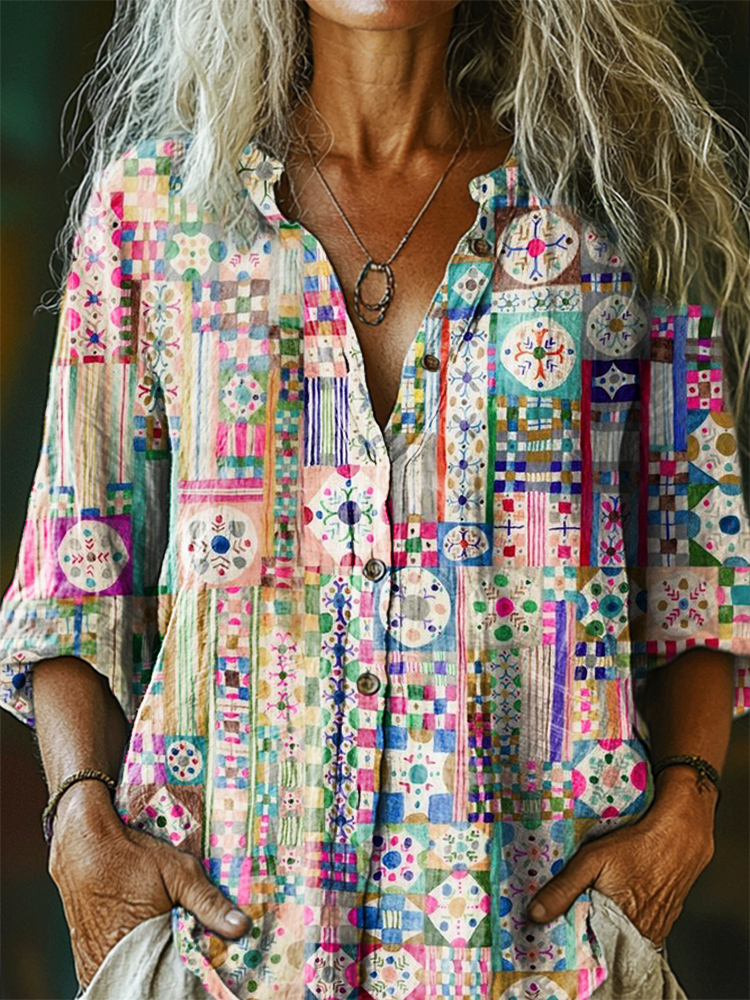 Irregular Pattern Art Print Cotton Linen Casual Women's Shirt