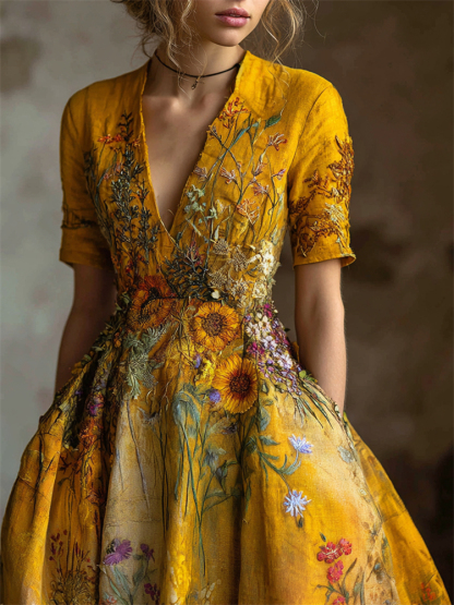 Oil Painting Inspired Wild Flowers Embroidered Linen Maxi Dress