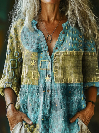 Patchwork Pattern Art Print Cotton Linen Casual Women's Shirt