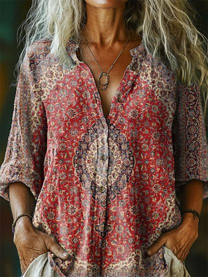 Vintage Ethnic Style Pattern Art Printed Cotton and Linen Casual Women's Shirt