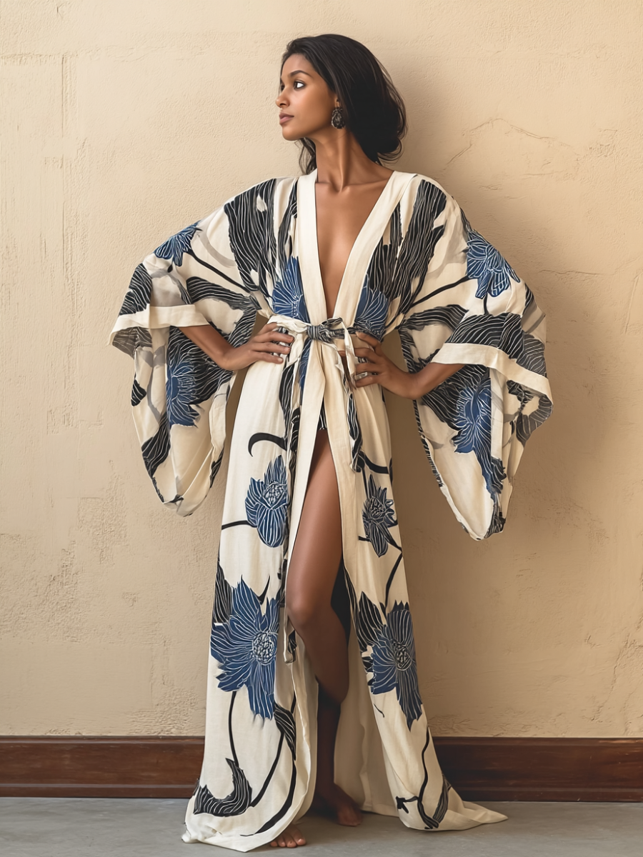 Chic design: The blue flower pattern on a white background features traditional kimono-style sleeves and an elegant silhouette with a belt for a flattering fit.