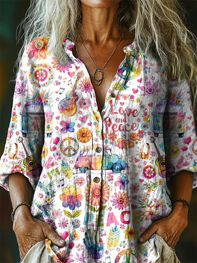 Women's Hippie Love Peace Art Print Casual Cotton And Linen Shirt