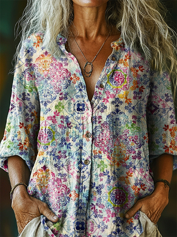 Women's Retro Ethnic Floral Art Print Casual Cotton And Linen Shirt