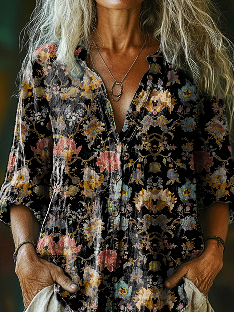 Women's Retro Ethnic Floral Art Print Casual Cotton And Linen Shirt