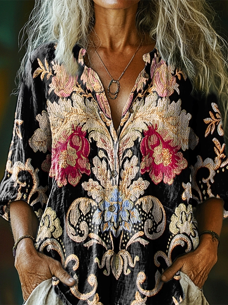 Women's Symmetrical Ethnic Flower Art Print Casual Cotton And Linen Shirt