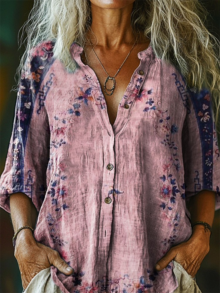 Women's Vintage Floral Art Print Casual Cotton And Linen Shirt