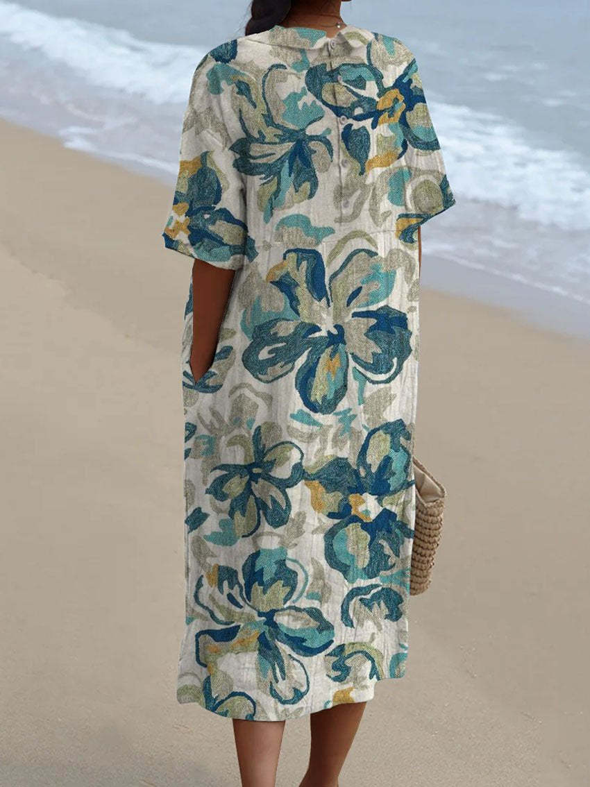 Women's Vintage Floral Art Print Pocket Linen Dress(Convertible Dress With Front And Back Option)
