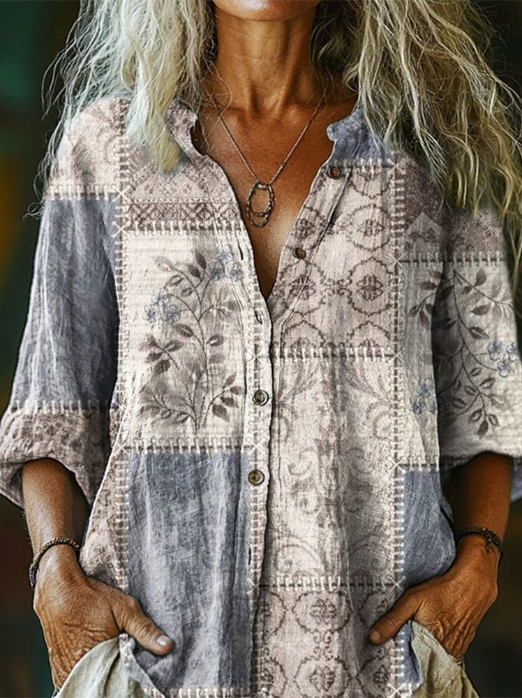 Women's Vintage Folk Floral Collage Art Print Casual Cotton And Linen Shirt