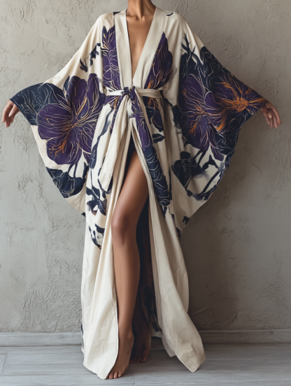 Women's Violet Flower Kimono Linen Robe (Including Belt)