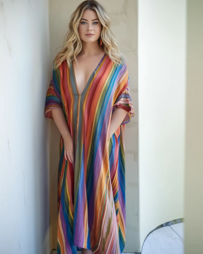 Contton & Linen Long Sleeve Rainbow Striped Kaftan Maxi Dress