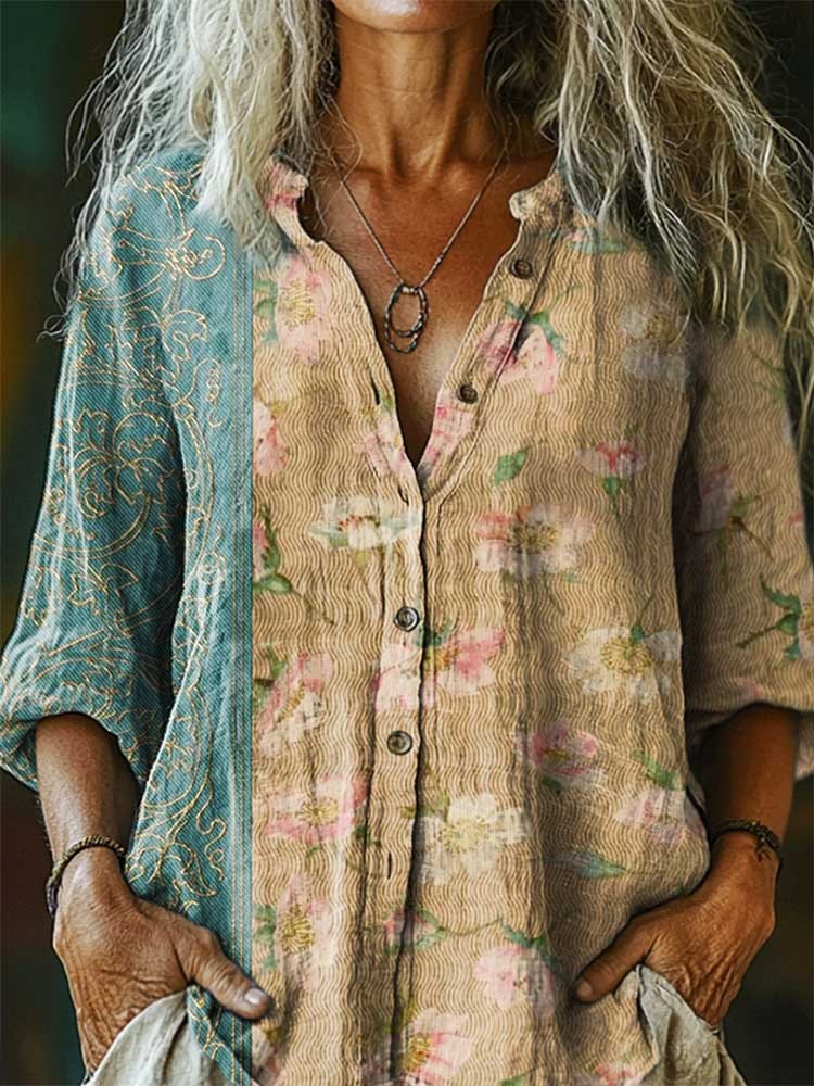 Floral Patchwork Pattern Art Print Cotton Linen Casual Women's Shirt