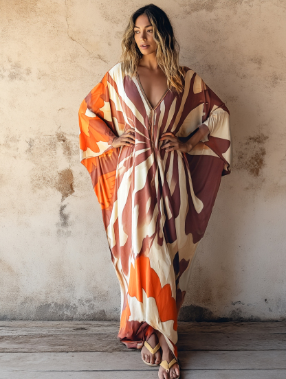 Orange Fantasy Art Linen V-Neck Kaftan