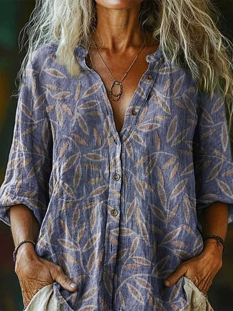 Women's Boho Leaf Art Print Casual Cotton Linen Shirt