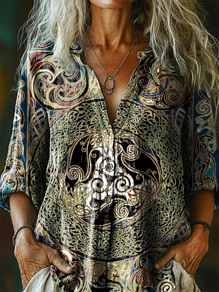 Women's Celtic Art Print Casual Cotton Linen Shirt