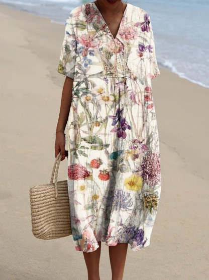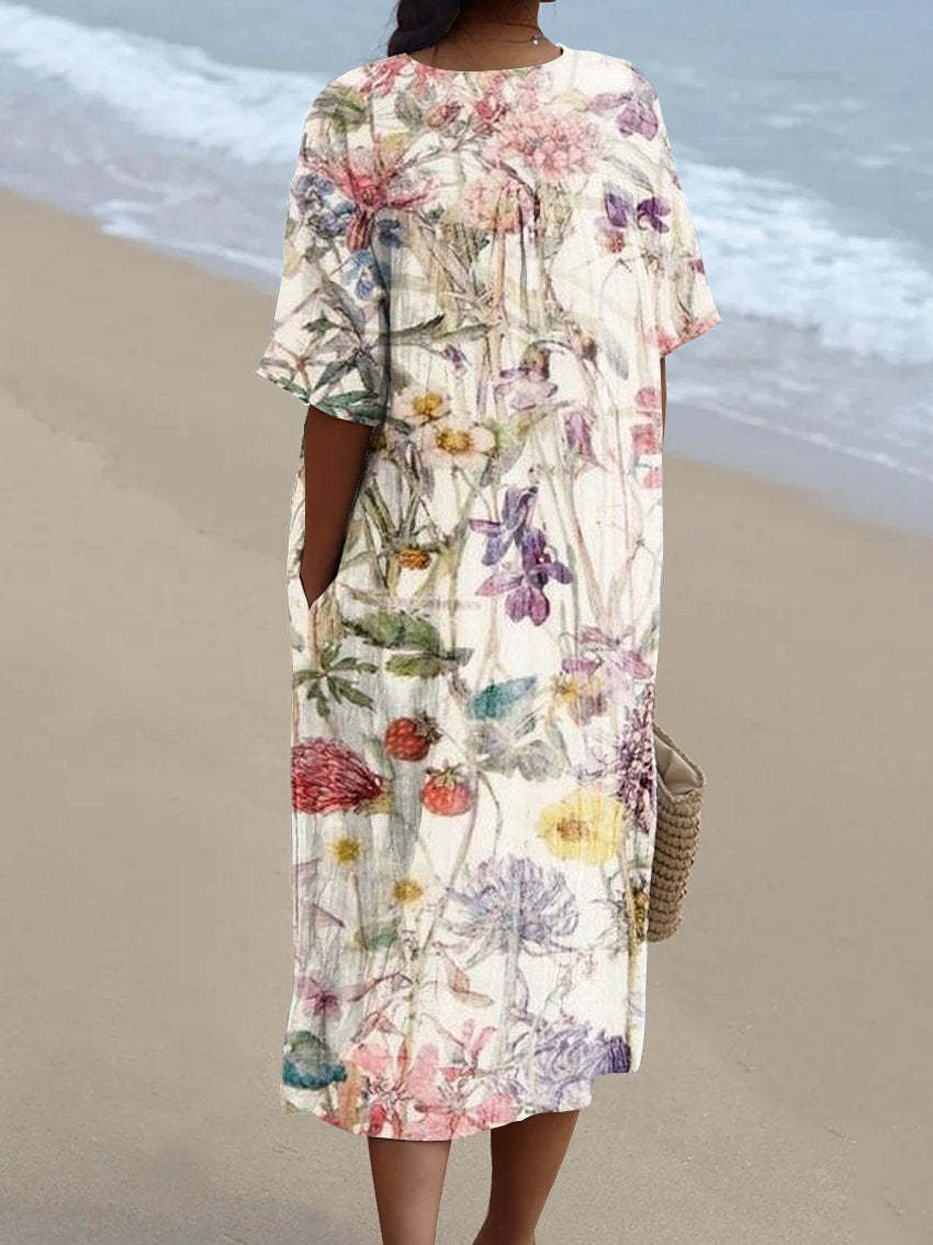 Women's Elegant Floral Print Pocket Linen Dress