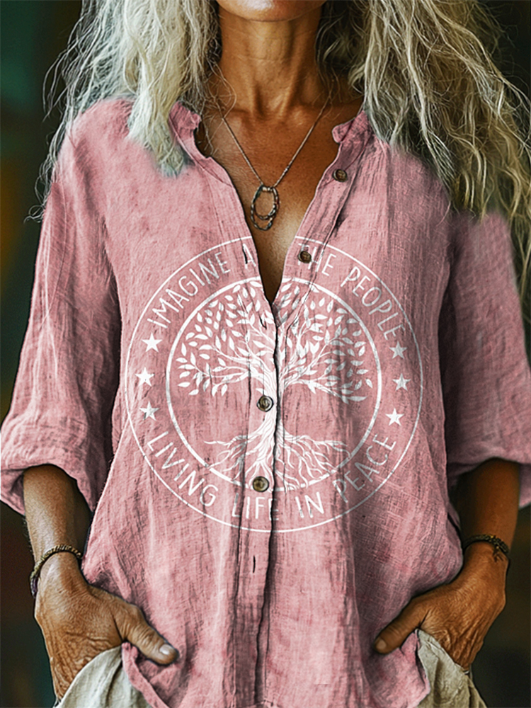 Women's Imagine All Living In Peace Pattern Art Print Casual Cotton Linen Shirt