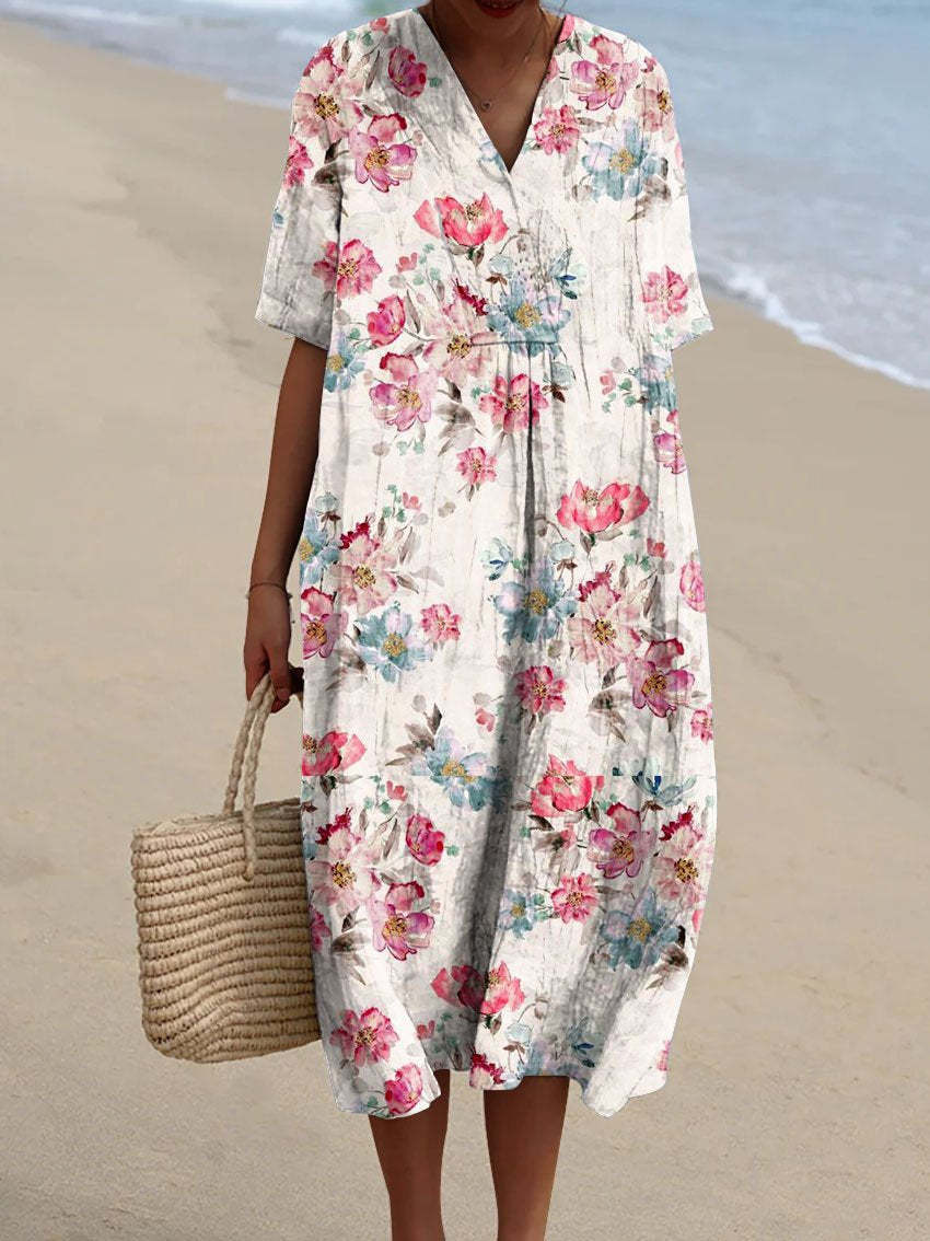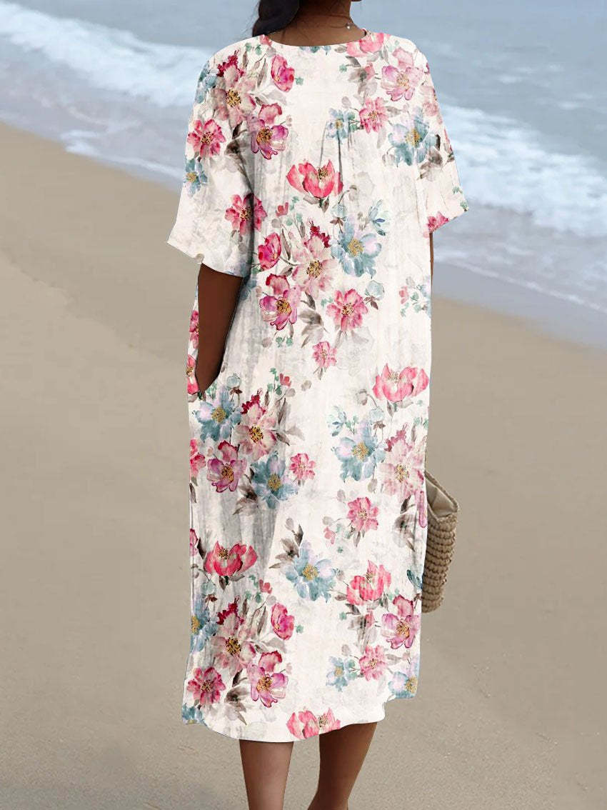 Women's Red Bouquet Print Pocket Linen Dress