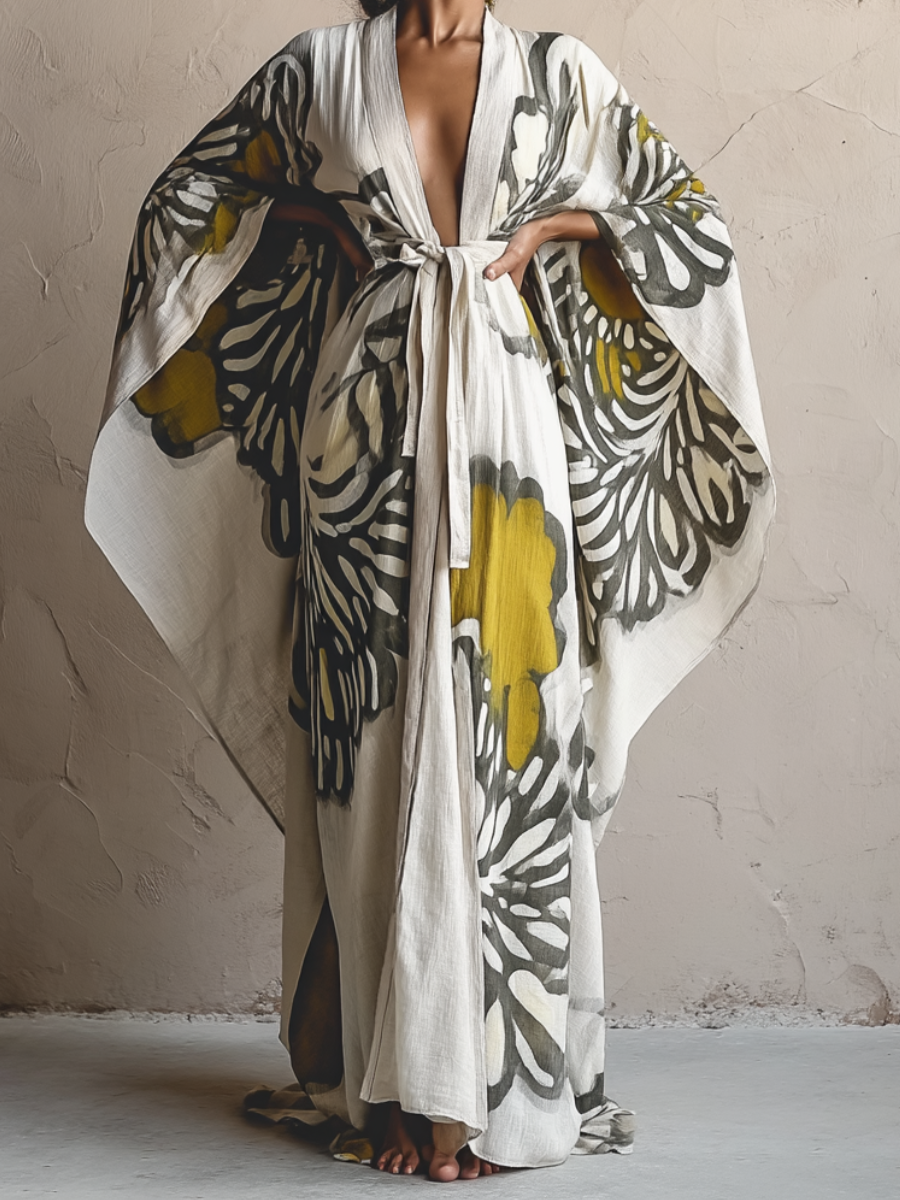Chic design: white yellow flowers, traditional kimono-style sleeves, and a sash perfectly frame the figure.