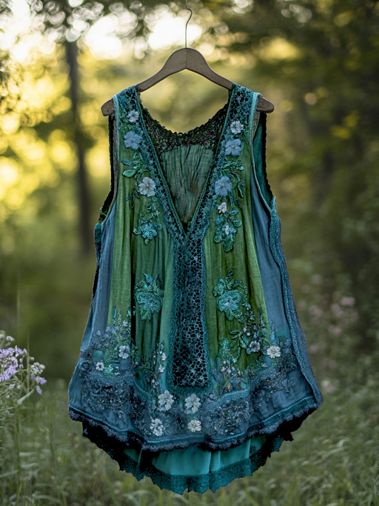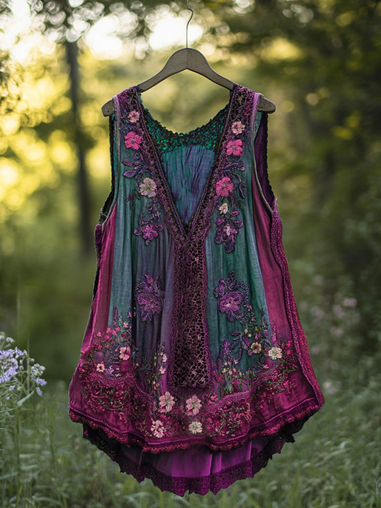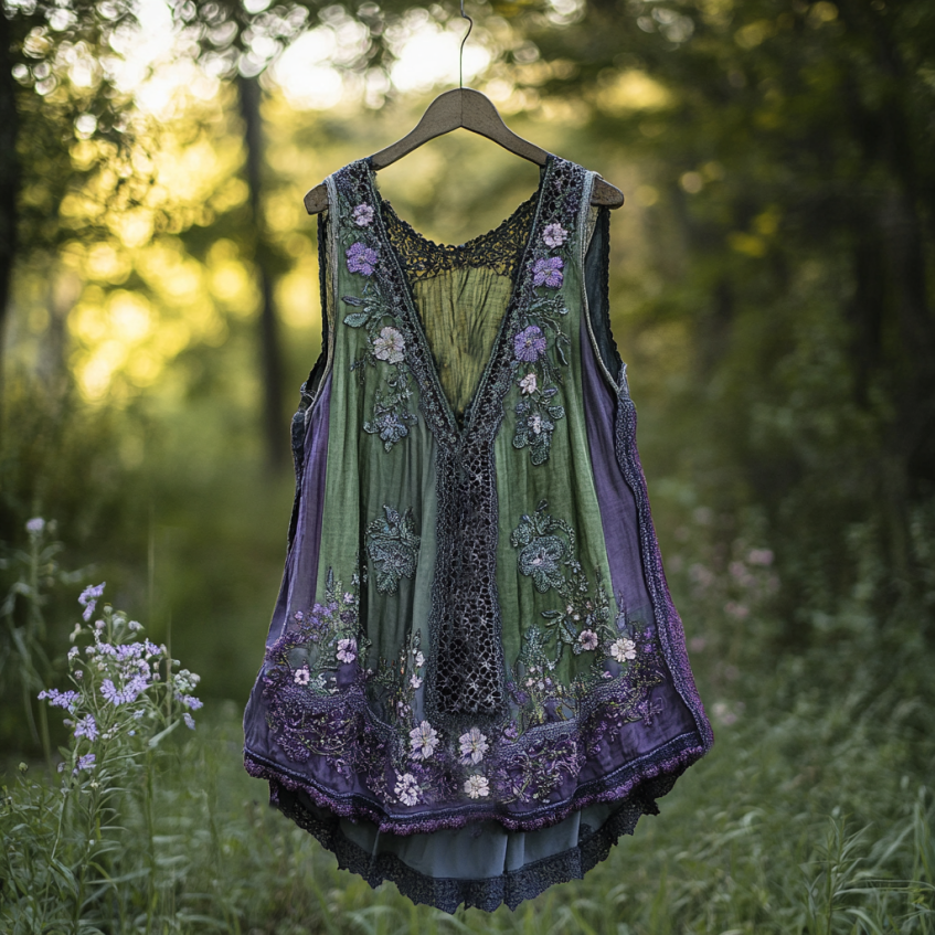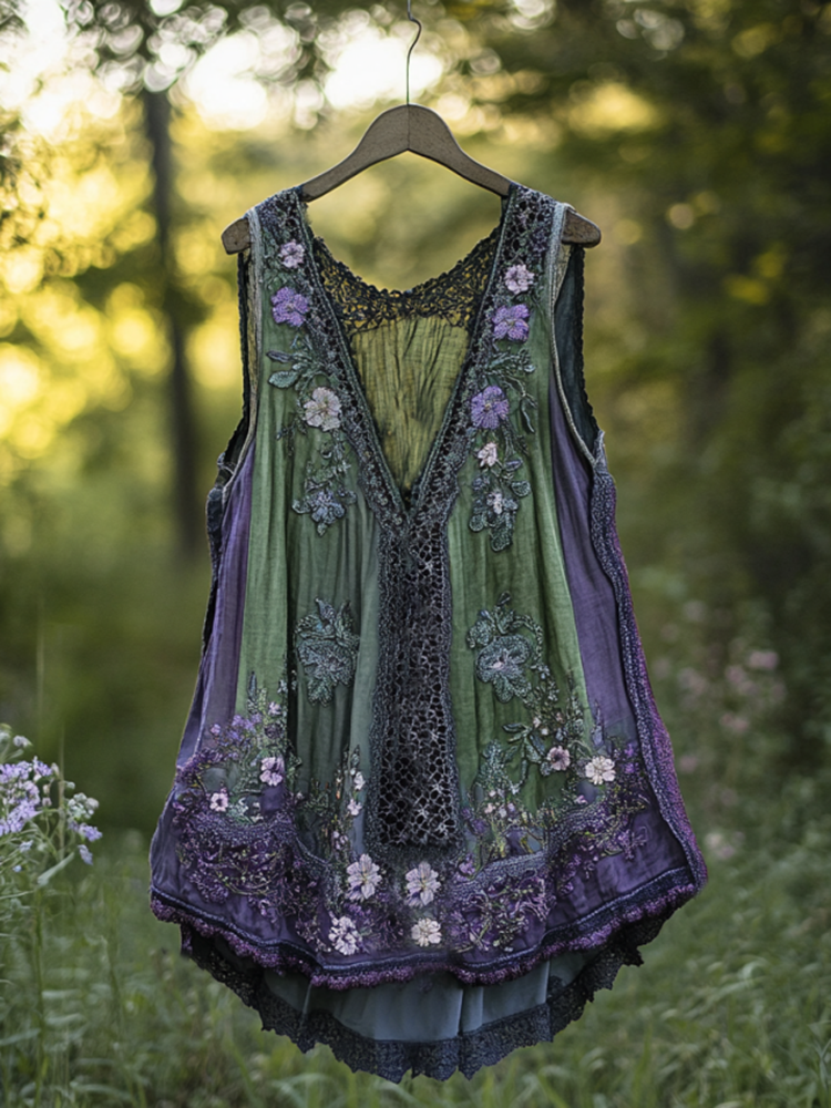 Boho Lavender Lace Art Linen Lace Patchwork Art Sleeveless Tank Top