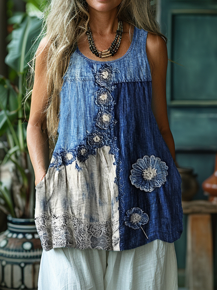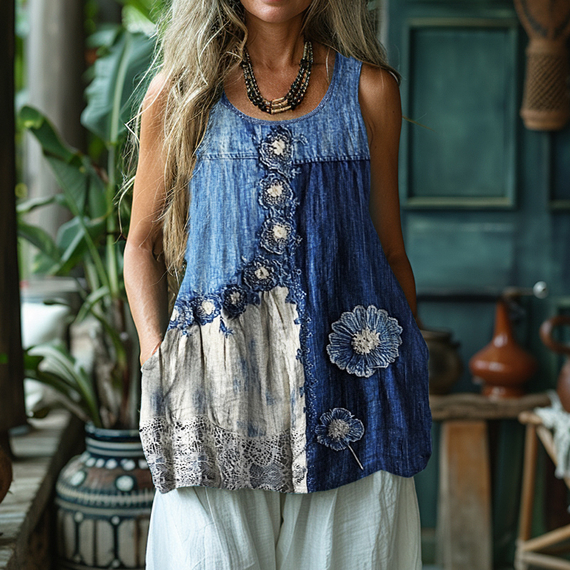Floral Denim Textile Lace Hem Patchwork Tank Top