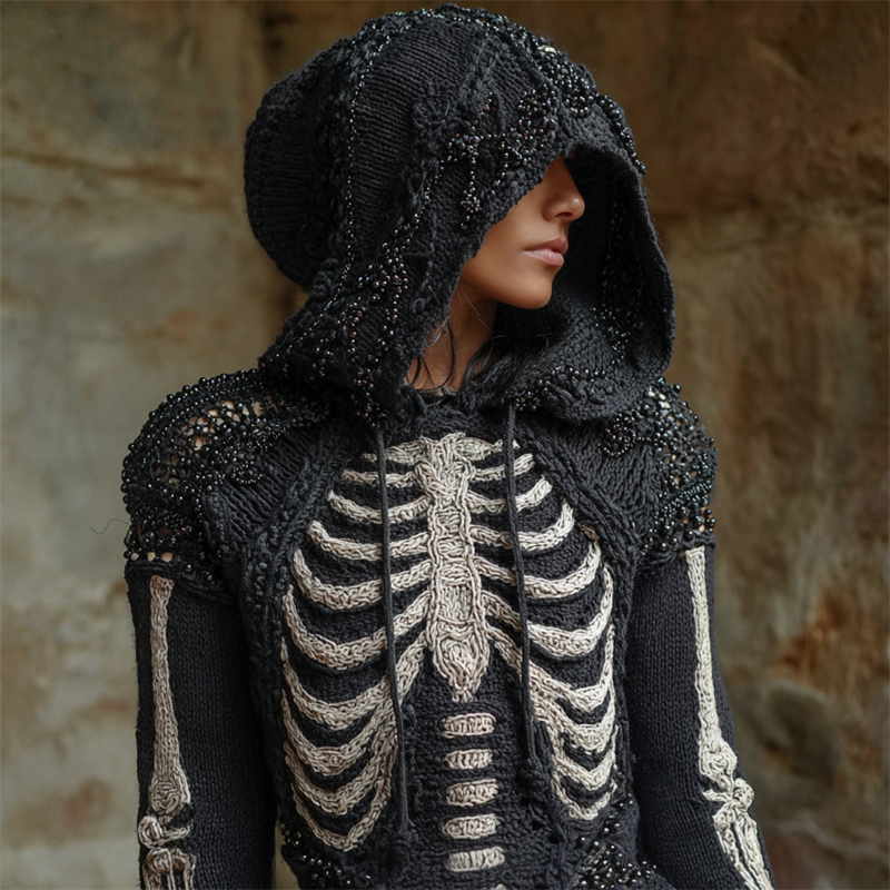 Vintage Gothic Skeleton Beaded Hooded Cozy Knit Sweater