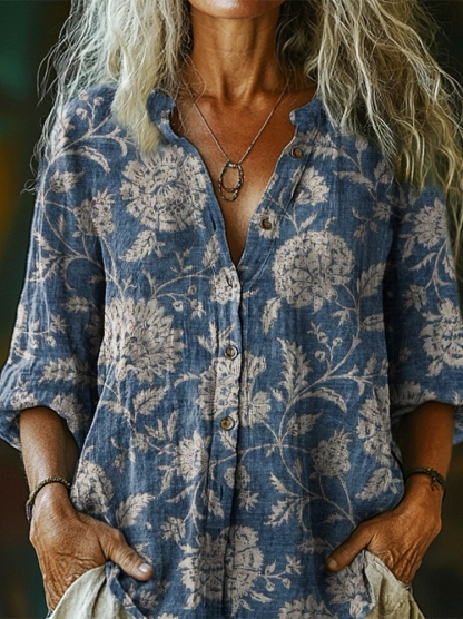 Women's Bohemian Vintage Folk Floral Art Pattern Print Casual Cotton Linen Shirt