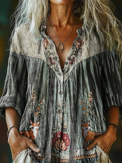 Women's Floral Fox Pattern Art Print Casual Cotton Linen Shirt