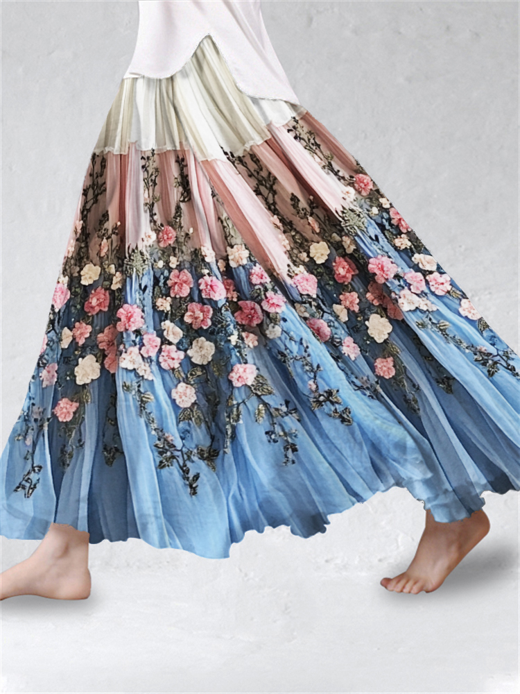 Floral Embroidered Transgender Colorblock Flowy Wide Skirt