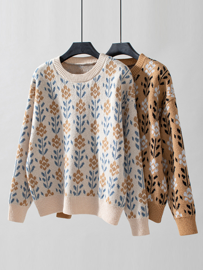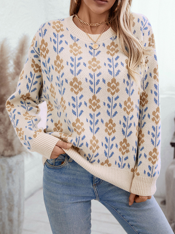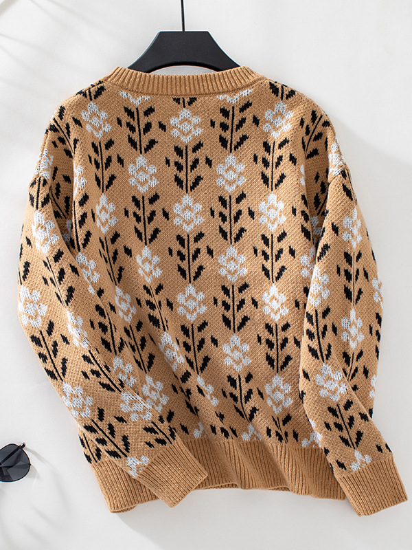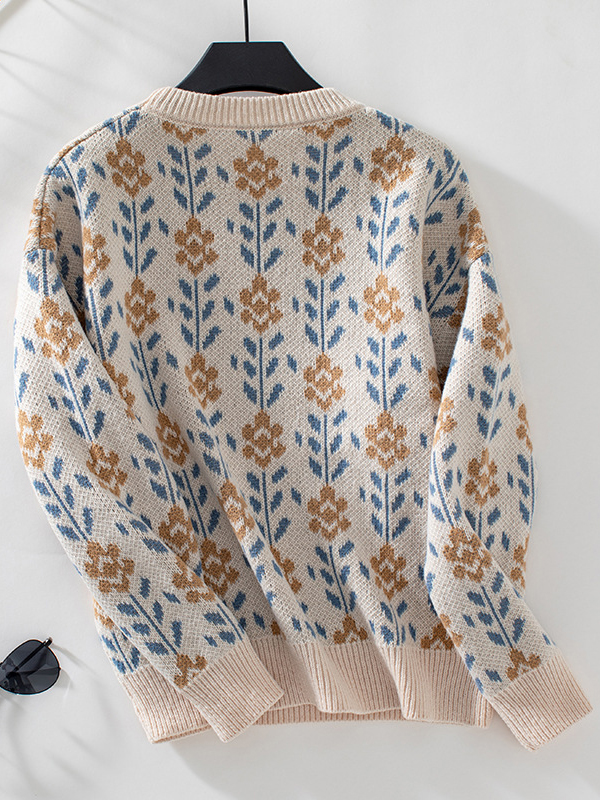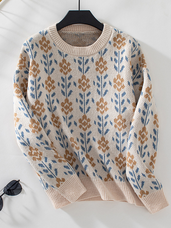 Long Sleeves Loose Knitted Flower Split-Joint Round-Neck Pullovers Sweater Tops