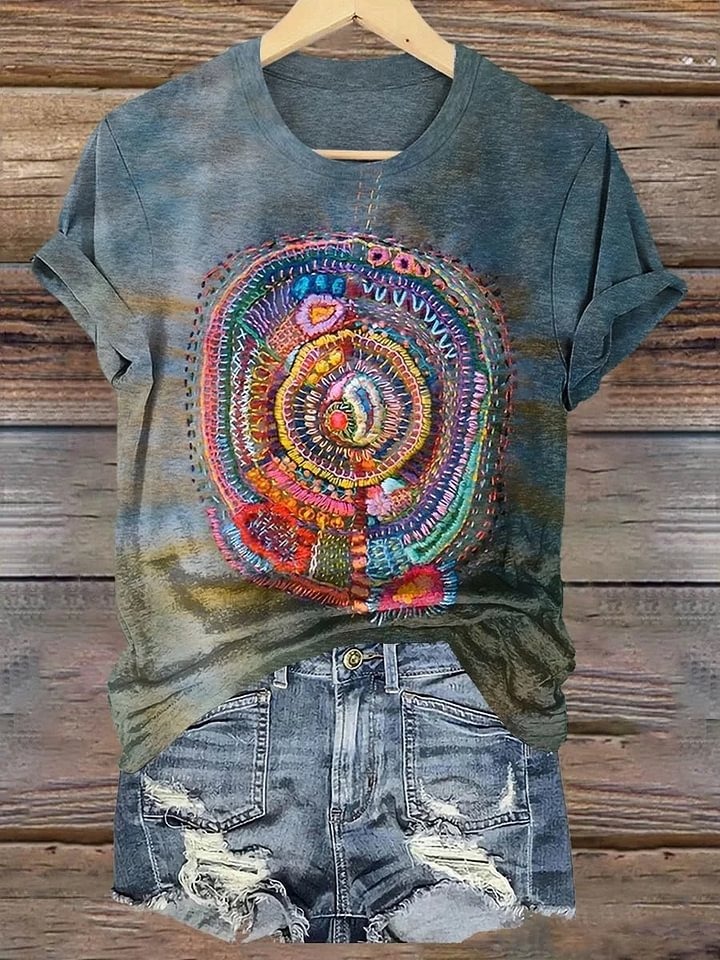 Unisex Vintage Line Embroidery Printed Casual Loose Short Sleeve T-Shirt