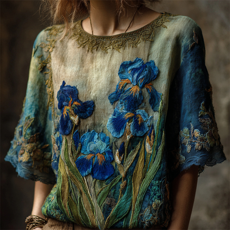 Vintage Irises Embroidered Gradient Flowy Linen Tunic