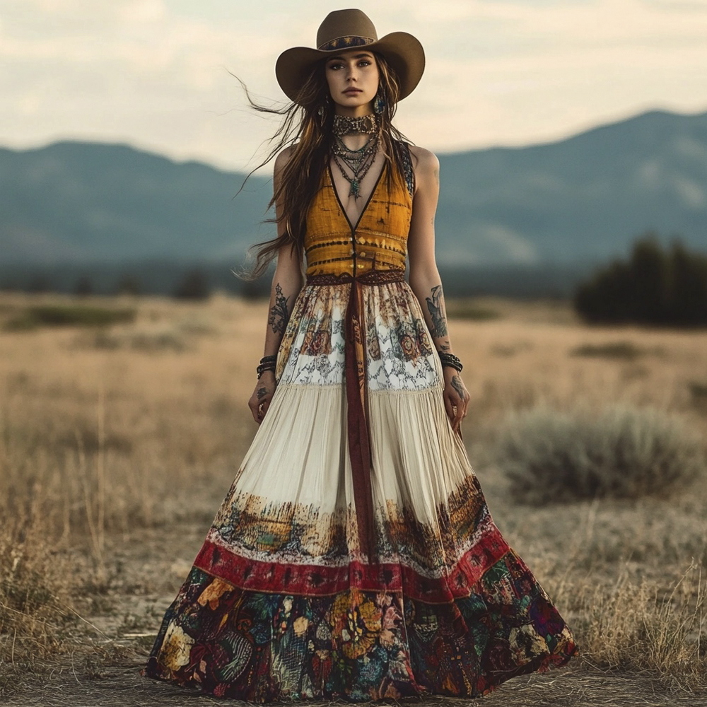 Western Vintage Floral Pattern Women's Lace-up Maxi Dress