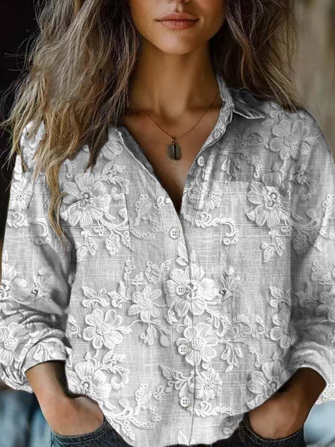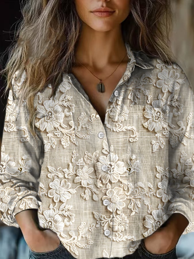 Women's Casual Vintage Floral Cotton and Linen Shirt