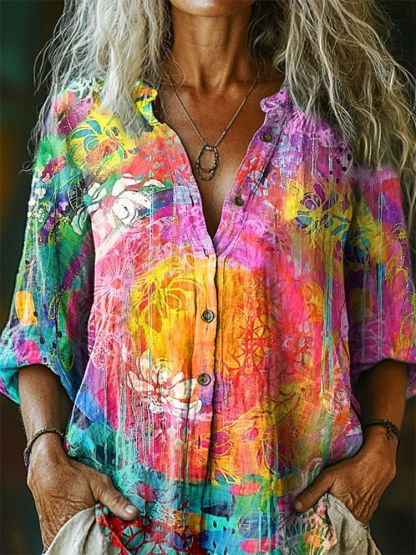 Women's Colorful Floral Pattern Art Print Casual Cotton Linen Shirt