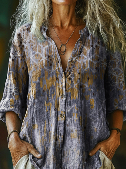 Women's Vintage Ethnic Floral Art Print Casual Cotton Linen Shirt