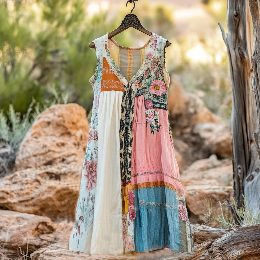 Women's Vintage Floral Applique Art V Neck Dress