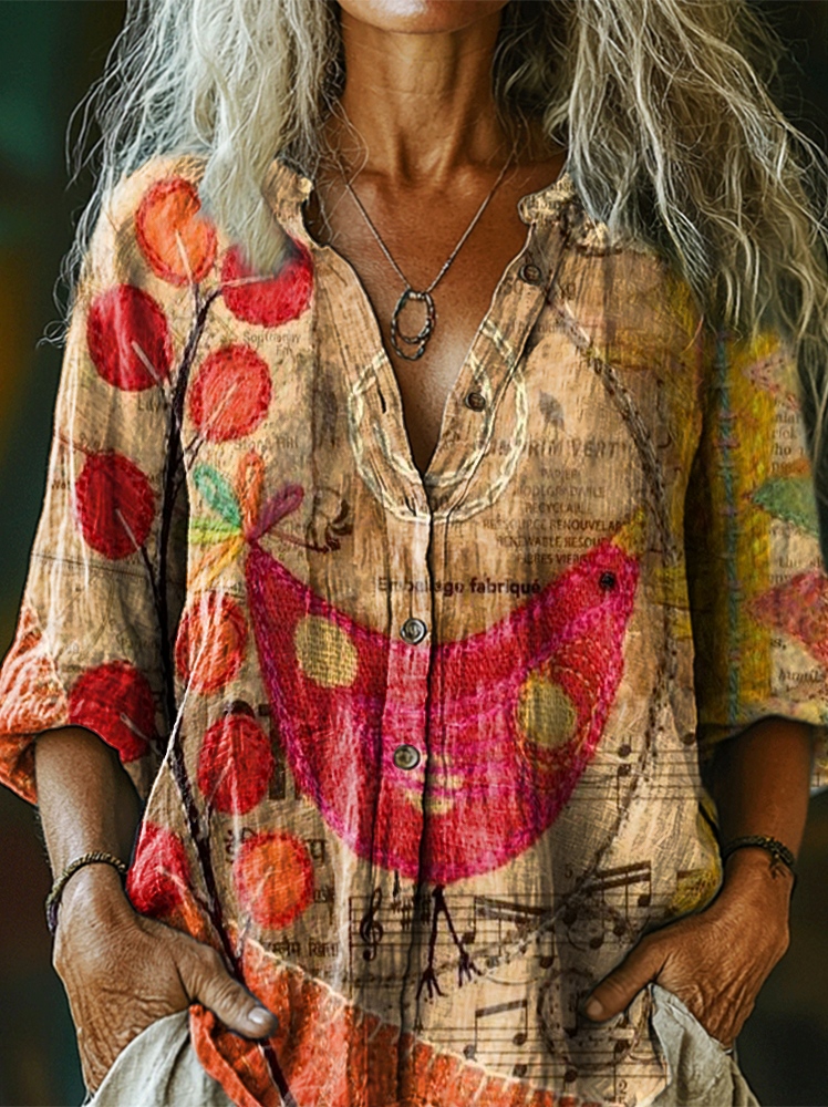 Women's Vintage Floral Bird Print Casual Cotton Shirt