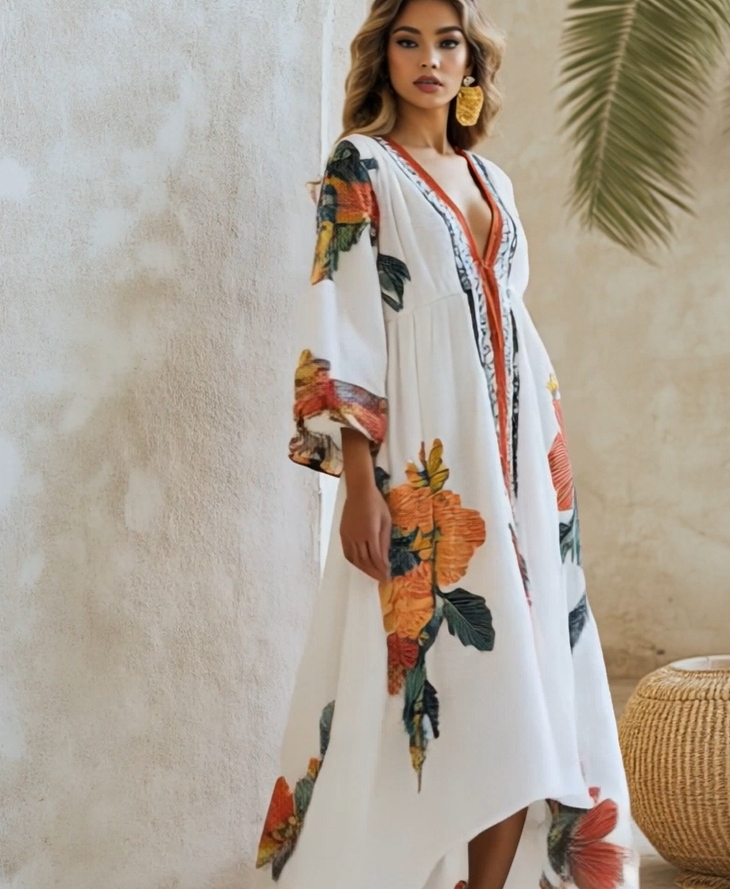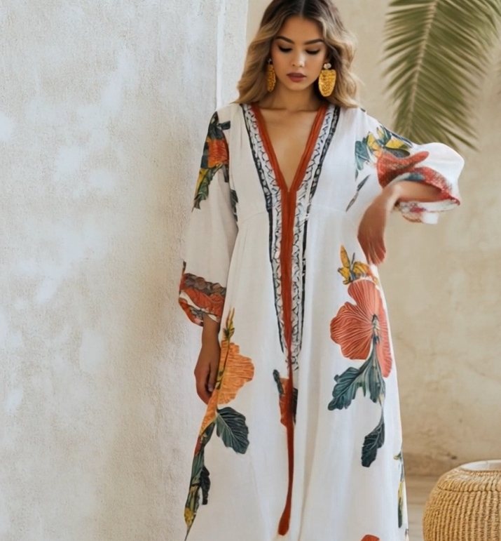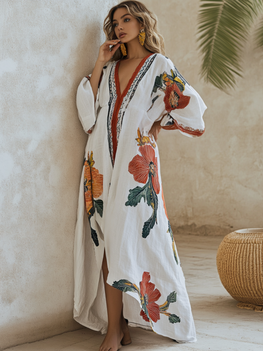 Flower Pattern Printed Linen Cotton Kaftan