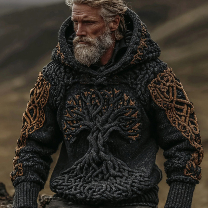 Men's Viking Tree Of Life Art Celtic Knot Jacquard Knitted Hooded Sweater